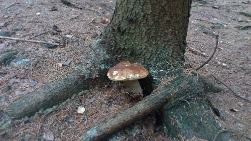 Foto: Gerne verstecken sich Steinpilze im Wurzelabzweig eines Fichtenstammes. Hier stehen sie wettergeschützt und warm. (Foto © Dine)