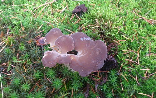 Foto: Der Zitterzahn war groß! Das Verhältnis zu dem vergehenden Lila Lacktrichterling im Hintergrund zeigt es. Zitterzähne sind essbar, und das auch roh. Roh oder abgebrüht sind sie gut in Salaten verwendbar. (2 Fotos © Dine)