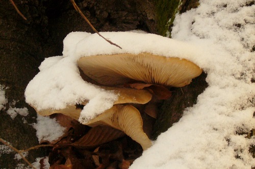Foto: Sie sind verschneit und hart gefroren. Das macht gar nichts. Gebraten oder fritiert schmecken Austernseitlinge allemal. (Foto © Susann)