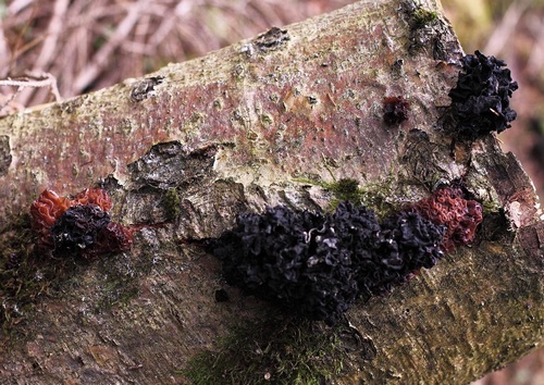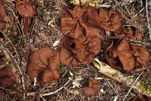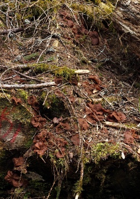 Nach wie vor wächst auch der Graublättrige Schwefelkopf. Überwältigt war ich von einem riesigen Vorkommen des Größten Scheiblings auf alten, morschen, liegenden Holzstämmen, vermutlich Fichte. Einen Ausschnitt habe ich fotografiert. Alle waren gar nicht auf ein Bild zu bekommen. Das waren weit über 100 Fruchtkörper. Auch wenn der Speisewert umstritten ist, ich habe mir einige mitgenommen und probiert. Sie schmeckten mir sehr gut und sind mir bekommen.