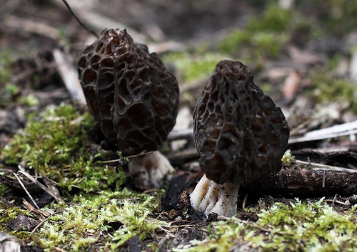 Foto: Zwei kräftige Spitzmorcheln im naturnahen Wald und nicht, wie zuletzt häufig zu sehen, im Mulchbeet. (Foto © Christian Olsson)