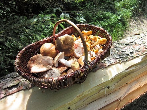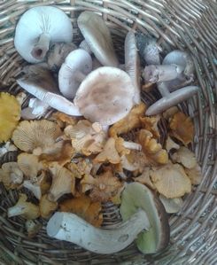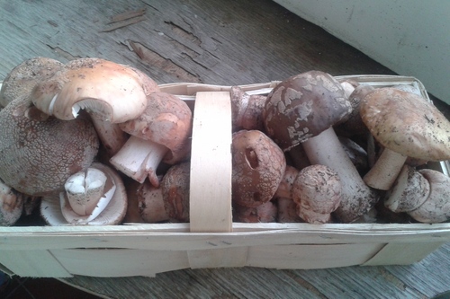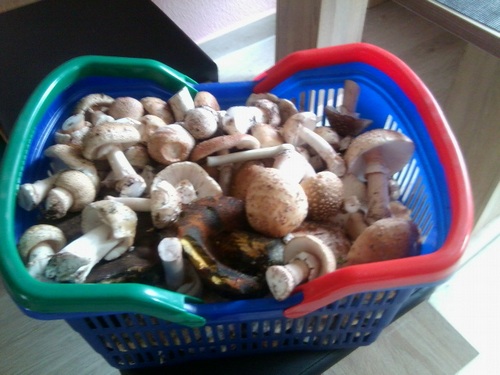 Foto: Einen Korb voller Perlpilze hat Viola gefunden. Einige wenige Hexenröhrlinge haben sich zur Farbaufmunterung eingeschlichten. (Foto © Viola)