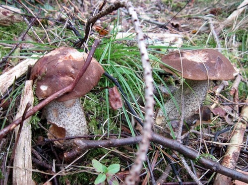 Der Fichtenwald war genau so trocken, aber an Stellen, wo sich nachts infolge des Nebels Feuchtigkeit sammeln konnte, standen die Steinpilze. Im Gras hielten sich auch Birkenpilze und zwei Hexenröhrlinge versteckt.