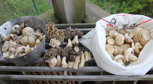 Foto: Links Blassbraune Schlehenrötlinge und Schildrötlinge, in der Mitte Speisemorcheln und Käppchenmorcheln, rechts Maipilze, von denen hier nur der bescheidene Rest von vorher knapp zwei Kilo zu sehen ist. Die meisten wurden verschenkt. Ein Pilzgang am Samstagabend und ein nachfolgender am Sonntagmittag trug mir ein schönes Ernteresultat ein. (Foto © p-p-s.com)