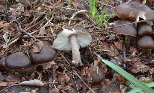 Foto: Auch die Rehbraunen Dachpilze zählen zu den frühen Pilzen im Jahr, vor allem, wenn sie wärmebegünstigt in kompostähnlichem Milieu wachsen können. Sie zersetzen totes organisches Substrat - wie in Antjes Fall Holzstreu von den Meerschweinchen.