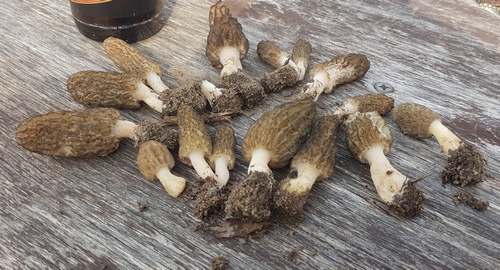 das sind Spitzmorcheln, die zu den köstlichsten Pilzen überhaupt zählen. Verschenk sie nicht!