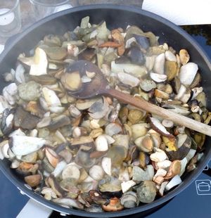 Außerdem fanden wir Birkenpilze, Flockis und Stäublinge. Das ergab wieder einmal eine schöne bunte Mischung, deren Ergebnis in der Pfanne rechts zu sehen ist.
