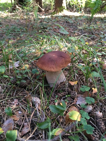 Da standen auf einmal Riesensteinpilze (siehe ein besonders schöner Foto rechts) zwei Birkenpilze und zwei Rotfüße. Auf einen Flockenstieligen Hexenröhrling hätte ich beinahe draufgetreten, so perfekt war seine Hutfarbe an den Waldboden angepasst. Endlich war mein Korb nicht mehr leer!
