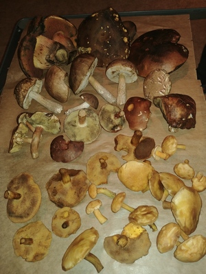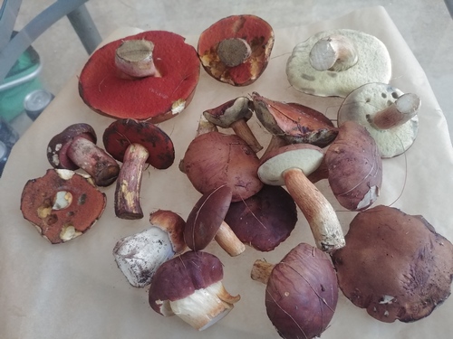 Entschuldigt, wenn ich die genauen Namen nicht kenne, aber denke, Ihr könnt trotzdem was damit anfangen: es gab Birkenpilze, Steinpilze, Speckpilze, Ziegenlippen, Braunkappen, Trompeter, Ziegenbart, Graspilze, Hallimasch, Pfifferlinge, kleine Fette Henne, Waldchampignons, Mehler und die, die immer blau werden, die auf dem Extra-Foto rechts zu sehen sind. Für mich sind es Satanspilze.