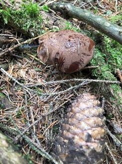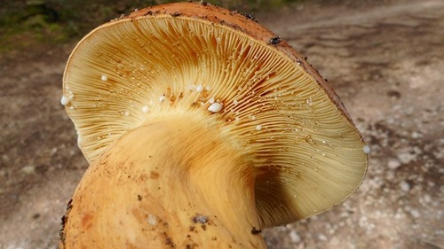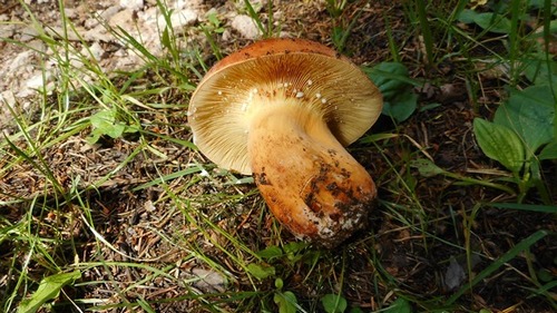 Foto: Hier ist einer der Brätlinge im Ganzen zu sehen. Die Stielfarbe gleicht zur Basis hin nahezu komplett der des Hutes.Die Pilze riechen nach Heringslake, ein Geruch, der beim Garen vollkommen verfliegt.