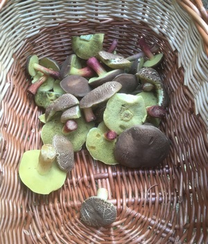 Wir wurden zwar vom Regen überrascht, doch das störte keineswegs. Bei angenehmen 14 Grad machte das Sammeln richtig Spaß und wir genossen die frische saubere Luft. Gefunden haben wir schöne Maronen, Butterpilze und einen Hexenröhrling.