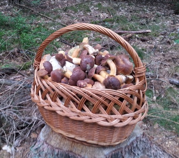 Ich habe jede Menge Maronen und Rotfußröhrlinge gefunden.Dazu noch einige große Birkenpilze und ein paar Steinpilze. Der prall gefüllte Korb (Foto rechts) bietet doch einen herrlichen Anblick!
