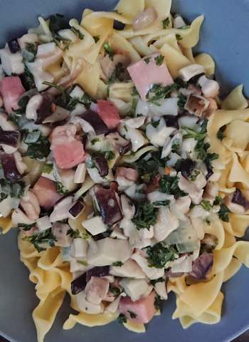 Bandnudeln mit Schinken-Steinpilzsauce gezaubert (2. Foto rechts) - ein Gedicht! Zum
