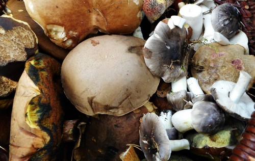 Foto: Rechts im Korb liegen die Herbstlinge (Schwarzfaserigen Ritterlinge). Den anderen Pilzen sieht man an, dass die Nager und Schnecken allmählich größeren Hunger auf Pilze haben.
