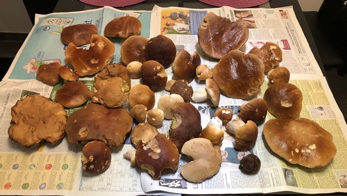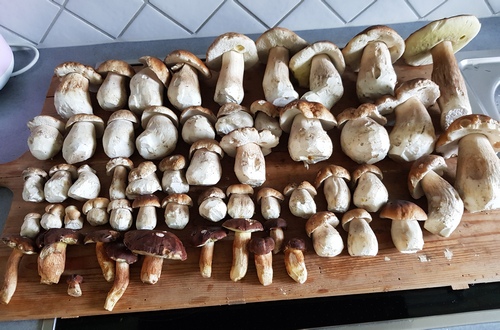 Das Ergebnis kann sich sehen lassen. Und alle abgebildeten Steinpilze waren knackig, frisch und wurmlos. Dazu gab es noch ein paar kleine Butterpilze, einen Waldchampignon, einen Hexenröhrling und ein paar Maronen.