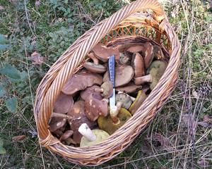 Anmerkung: Im Korb sind zu sehen Maronenröhrlinge und ein Steinpilz.