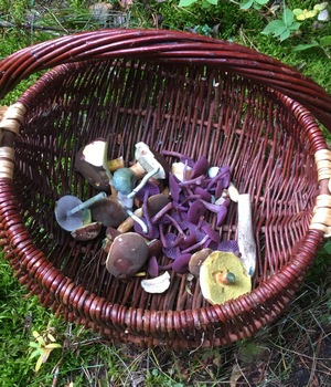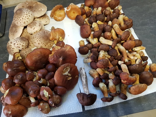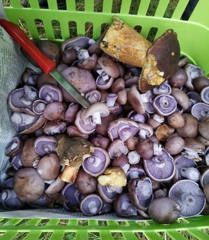 Ich habe einige Grünspanträuschlinge, viele Lila Lacktrichterlinge, ein paar Maronen, einen Birkenpilzstiel (den Hut hatten die Schnecken verputzt) gefunden. Die Rotfüße waren leider fast ausnahmslos sehr schimmelig.