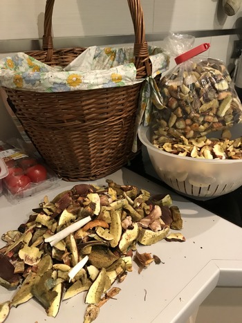 Leider waren die Rotfüßchen zum Teil sehr madig, siehe das 2. Bild; im Vordergrund der beträchtliche Abfall. Es wurde dennoch ein leckeres Abendbrot auf Dinkelbrot und eine Tüte zum Einfrieren sprang auch noch heraus. Neben den Rotfüßen waren auch Goldröhrlinge, ein wenig Hallimasch und zwei Schopftintlinge mit im Korb.