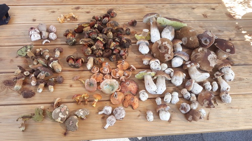 Steinpilze, Hexenröhrlinge, Maronen, Fichtenreizker, Safranschirmlinge, Perlpilze, Lärchenröhrlinge, Ziegenlippen und zwei kleine Pfifferlinge waren mein Ergebnis. Die Schnecken und Würmer haben von diesem Fund allerdings mindestens die Hälfte gefressen.
