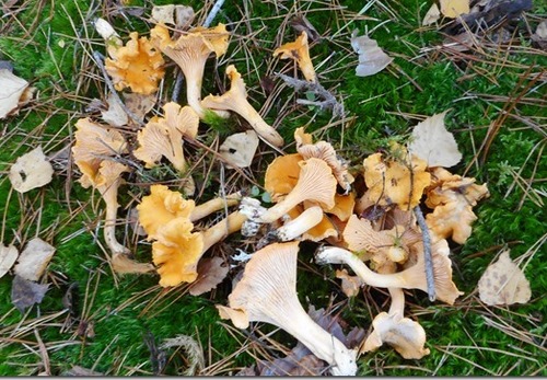 Foto: So viele frische gute Pfifferlinge Ende Oktober sind kein alltäglicher Anblick. Die Schwarzfaserigen Ritterlinge hingegen sahen schon recht mitgenommen aus. Kein Wunder bei den warmen Temperaturen in den letzten Tagen, denn sie sind Kälteliebhaber, denen auch die ersten Nachtfröste nichts ausmachen. (2 Fotos © Hermann)