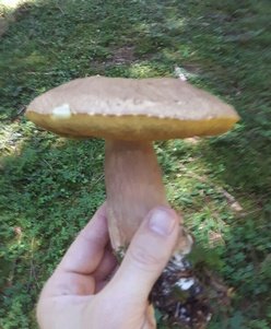2 Fotos: Überglücklich hält Philipp seinen ersten Steinpilz hoch, wohl ein Sommersteinpilz, dem er schon eine ganze Weile nachgestellt war. Auch einen Flockenstieligen Hexenröhrling (rechts) hat er noch gefunden. (2 Fotos © Philipp Z.)