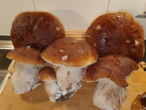 Und dann standen sie plötzlich da: wunderschöne Steinpilze, so gross - das habe ich noch nie gesehen. 3 Steinpilze zusammen wogen 2.5 Kilogramm und hatten beste Qualität!
