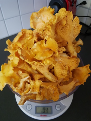 Da der Grossteil des Waldes von Dornengestrüp überwuchert war, wollte ich schon enttäuscht abbrechen. Da leuchtete es mir unter den Dornen hervor Goldgelb entgegen. Eierschwämme hatten sich unter den Dornenranken versteckt! Welch ein toller Fund. Nach dem Putzen blieb ein gutes Kilo prachtvoller Exemplare von Handtellergrösse übrig (Foto rechts).