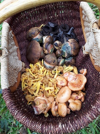 Foto: Hier hat Martin seinen Korb vom ersten Foto geleert und zeigt die Pilze noch einmal getrennt nach Gruppen. Wir sehen (im Uhrzeigersinn) Trompetenpfifferlinge, Nelkenschwindlinge, Weisstannenreizker, Flockenstielige Hexenröhrlinge, Totentrompeten - und in der Mitte einen jungen Parasol.