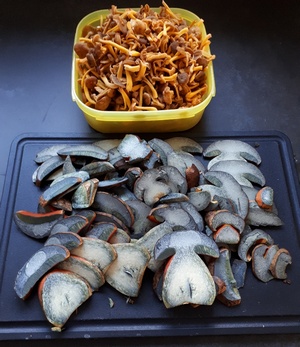 Das letzte Foto zeigt die in Scheiben geschnittenen blauenden Flockis mit den Trompetenpfifferlingen dahinter.