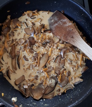 Heute gab es die gebratenen Pilze mit einer Rahmsauce (1. Foto rechts) einmal zu Knödeln, da noch einiges an altem Brot herumlag. Ein kleiner, köstlicher Beitrag gegen »Food waste«.