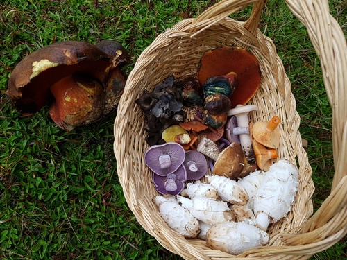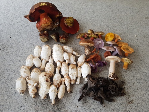 Dabei ist eine tolle, farbenprächtige Auswahl an schönen Herbstpilzen zusammengekommen: Schopftintlinge, welche gerade einen starken Auftritt haben, dann tolle Flockenstielige Hexenröhrlinge, Rotfussröhrlinge, ein Birkenpilz, Rötliche und Violette Lacktrichterlinge, ein Goldröhrling, Fichtenreizker, Violette Rötelritterlinge, ein Mönchskopf, ein Maronenröhrling und ein paar Herbsttrompeten.