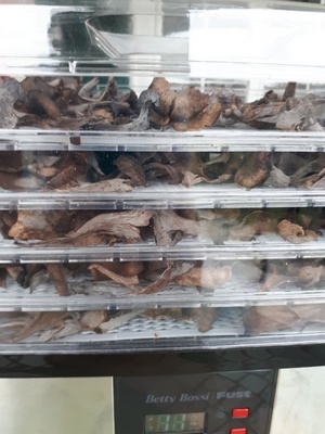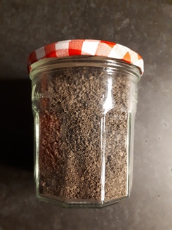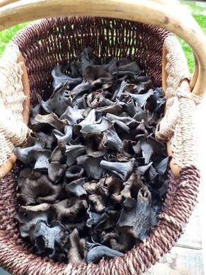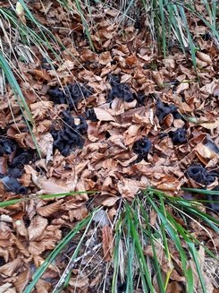 2 Fotos: Martin freute sich, dass die Totentrompeten dicht an dicht wuchsen. Und rechts sehen wir die Menge an Pilzpulver, die Martin aus seinem Kilo gesammelter Herbsttrompeten gewinnen konnte. Der Winter kann kommen, die Saucen und Suppen werden exzellent schmecken!
