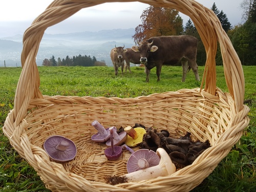 Foto: Ein herrliches Motiv! »Pilzkorb geniesst Blick auf Kühe, St. Gallen und Alpstein«, nennt Philipp diesen überaus gelungenen Schnappschuss. Aber auch umgekehrt scheint dies der Fall zu sein, denn die Kühe finden offenbar durchaus Gefallen an dem Korb mit dem farbenfrohen Inhalt. Und wer sich fragt, warum sie nicht lila sind, wird sich mit der Antwort zufrieden geben, dass dies schließlich schon vier Rötelritterlinge und ein Lacktrichterling sind.