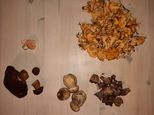 Nebst den Schweinsohren durfte ich 3 Maronenröhrlinge, 3 super knackige Steinpilze, 3 Semmelstoppellinge und eine schöne Portion Pfifferlinge in mein Körbchen packen.