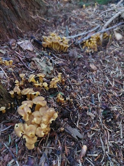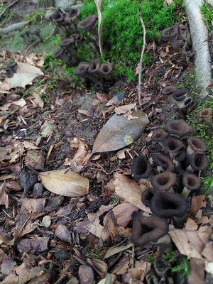 Ich fand im Wald viele Frauentäublinge, welche hier allerdings mit Schnecken geboren werden. Alle waren unbrauchbar. Die Totentrompeten und die Krausen Leistlinge, von denen ich heute einige neue Stellen entdeckte, sind weiter auf dem Vormarsch. Leider waren alle nass.