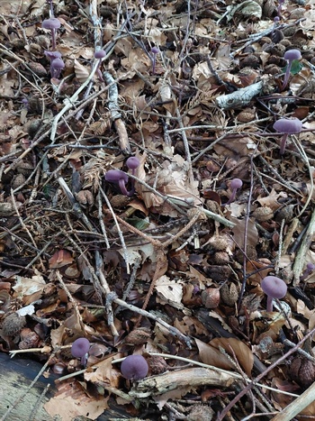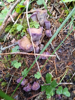 Auch die Trompetenpfifferlinge wachsen fleissig, sind aber noch klein. Sie wachsen ebenfalls an neu entdeckten Plätzen. Den Tagessieg im Wald errangen allerdings ganz klar die Violetten Lacktrichterlinge (2. Foto rechts). Sie wachsen zur Zeit üppig auf grossen Flächen.