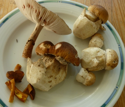 Zwei andere Steinis waren dagegen gut zu verwerten. Dazu fand ich Gelbstielige Leistlinge, Ziegenlippen, eine Marone, einen Goldröhrling und einen schönen Parasol. Auch drei Schopftintlinge waren zu sehen, blieben aber stehen. Insgesamt hatte ich einen schönen vollen Korb.