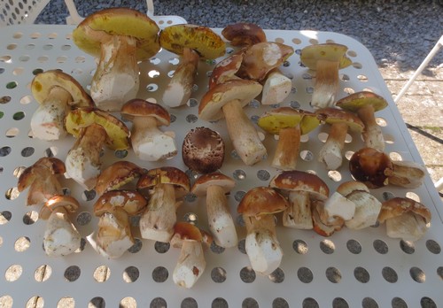 32 schöne Steinpilze, cirka 1 Kilo Waldchampignons, cirka 2 Kilo Rotfußröhrlinge, Reizker, Boviste und vieles mehr landeten in meinem Korb.