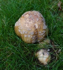 Foto: Es sind Perlpilze, die da in Helmuts Garten fröhlich wachsen. Man erkennt sie am rötlichen Schimmer des Fleisches und an den grauen Schüppchen auf dem Hut. Pilzfreund Franz hatte sie kürzlich im Bayern-Pilzticker zu Recht als ausgezeichnete Speisepilze gewürdigt (Tageseintrag vom 15. August 2017). (4 Fotos © Helmut von G.)