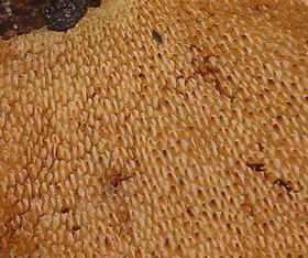 Foto: Schön kommt auf diesem Foto die typisch glänzende Huthaut des trockenen Kuhröhrlings zum Ausdruck. In der Vergrößerung auf dem zweiten Foto sind die länglich-eckigen Röhrenmündungen des Kuhröhrlings, deren Längsachse lotrecht verläuft, recht gut zu erkennen.