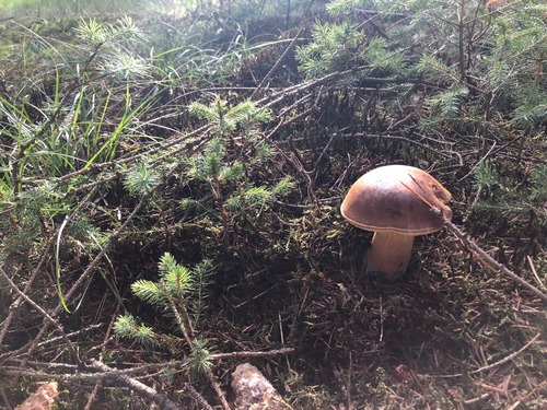 Frustriert fuhr ich mit dem Rad weiter zum nächsten Waldstück. Dort hatte ich bereits im letzten Jahr Maronen, Rotfußröhrlinge, schwarzblauende Röhrlinge und Safranschirmlinge gefunden. Und tatsächlich, vom Rad aus sah ich zwei helle Hüte am Fuß einer Fichte.