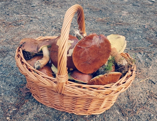 Foto: Da durfte sich Alma zu Recht freuen: Mit ihren jüngst erworbenen Anfängerkenntnissen für das Pilzesammeln hat sie gleich einen Korb voll kräftiger Maronen gefunden. Und einige Steinpilze zählten auch zu ihrer Ernte, siehe das Hochformatbild. (2 Fotos © Alma)