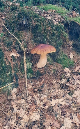 Foto: Mild und sonnig war's im Segeberger Forst, und Tobias staunte nicht nur über das Pilzaufkommen, sondern auch über die tolle Qualität der Pilze. Wie im Falle dieser Marone, die sich wie ihre Artgenossen in bester Verfassung zeigt. (Foto © Tobias)