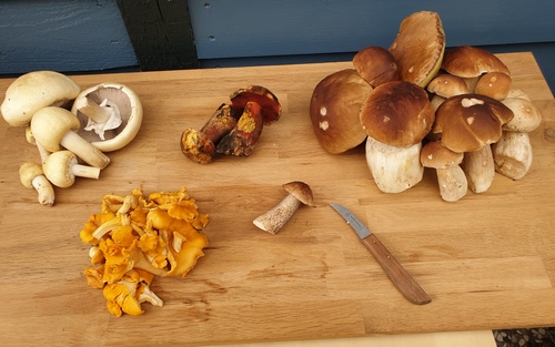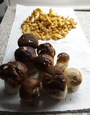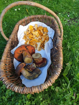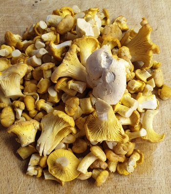 Geerntet habe ich Pfifferlinge und ein paar erste Netzstielige Hexenröhrlinge (Foto rechts).