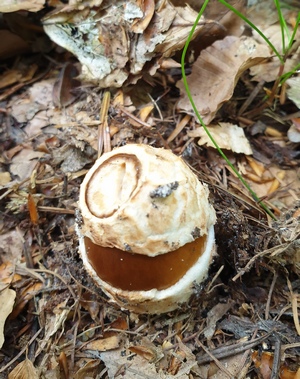 Foto rechts: Soeben ist die Gesamthülle (Velum universale) des noch sehr jungen Rotbraunen bzw. Fuchsroten Scheidenstreiflings gerissen. Sie umschließt den gesamten Fruchtkörper junger Scheidenstreiflinge, um infolge des Längenwachstums schließlich zu zerreißen. Alle Scheidenstreiflingsarten sind essbar.