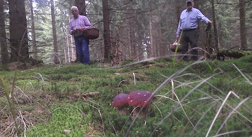 Foto: Achtung, sie kommen, mögen sich diese zwei Steinpilze denken. Aber auch sie sollten zum Teil schon vermadete Stiele haben. (Foto © Klaus Blumenberg)