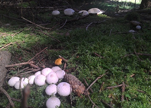 Foto: Auch solche Motive bieten sich derzeit im Oberharz: Ein Nest von Birnenstäublingen - mit einem Pfifferling als Unterhalter gegen die Langeweile. Im Hintergrund in Reih' und Glied vier Anischampignons. (3 Fotos © Klaus B.)
