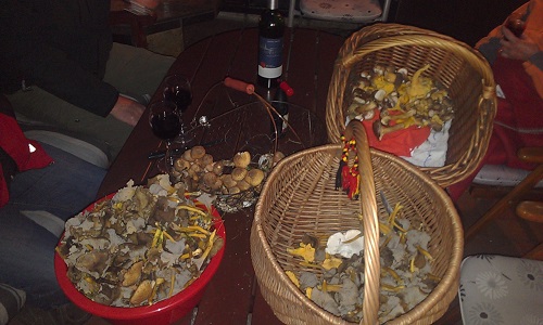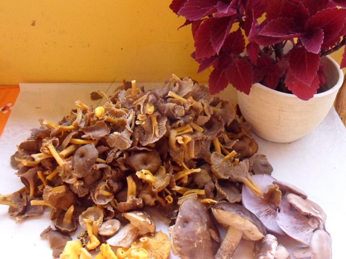 Foto: Trompetenpfifferlinge, Pfifferlinge, ein kleiner Steinpilz, Birkenpilze und Rötelritterlinge lagen erst im Korb, dann auf dem Tisch. Und Rainer war mit seiner Ernte und einem erholsamen Waldgang sehr zufrieden. (Foto © Rainer Luis)