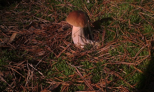 Foto: Da steht er, ein Steinpilz, wie aus dem Bilderbuch. Seine Hutform erinnert an einen Ritterhelm.