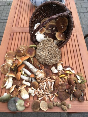 Heutige Funde waren: Raufußröhrlinge, darunter schöne Rotkappen, verschiedeneTäublingsarten, Sommer -und Fichtensteinpilze, Maronen, Goldröhrlinge, Hallimasch , Hexenröhrling und Birkenporlinge. Für die Stockschwämmchen war leider kein Platz mehr im Korb.